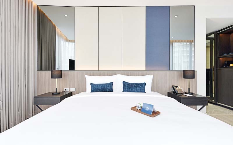 พักสบายใจกลางกรุงในห้อง Deluxe ที่กว้างกว่าใครในย่านเดียวกัน ด้วยพื้นที่ใช้สอย 30 ตารางเมตร ให้คุณได้พักผ่อนในบรรยากาศสบายไม่อึดอัด พร้อมโต๊ะทำงานและกระจกบานใหญ่ เปิดรับแสงธรรมชาติได้ตลอดวัน จะนั่งชมวิวจิบกาแฟก็ทำได้ง่ายๆ เพราะเราใส่เครื่อง Nespresso ไว้ในห้องพักทุกห้อง